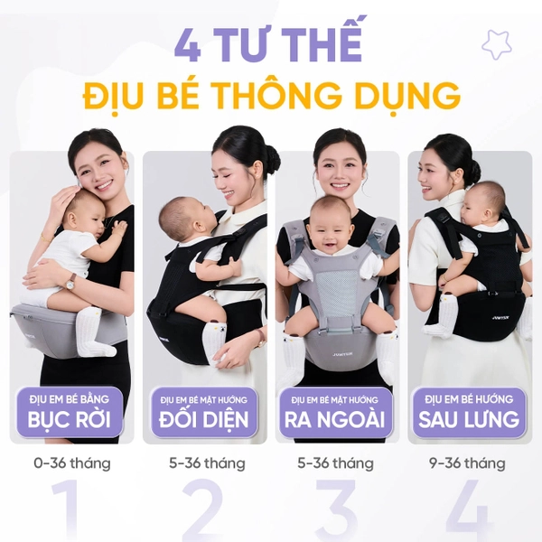 Jumysie M8 được thiết kế với 4 tư thế địu đa năng, phù hợp với từng giai đoạn phát triển của bé. Không cần mua nhiều loại địu khác nhau, chỉ cần một Jumysie M8 là đủ cho cả hành trình 36 tháng đầu đời của con!